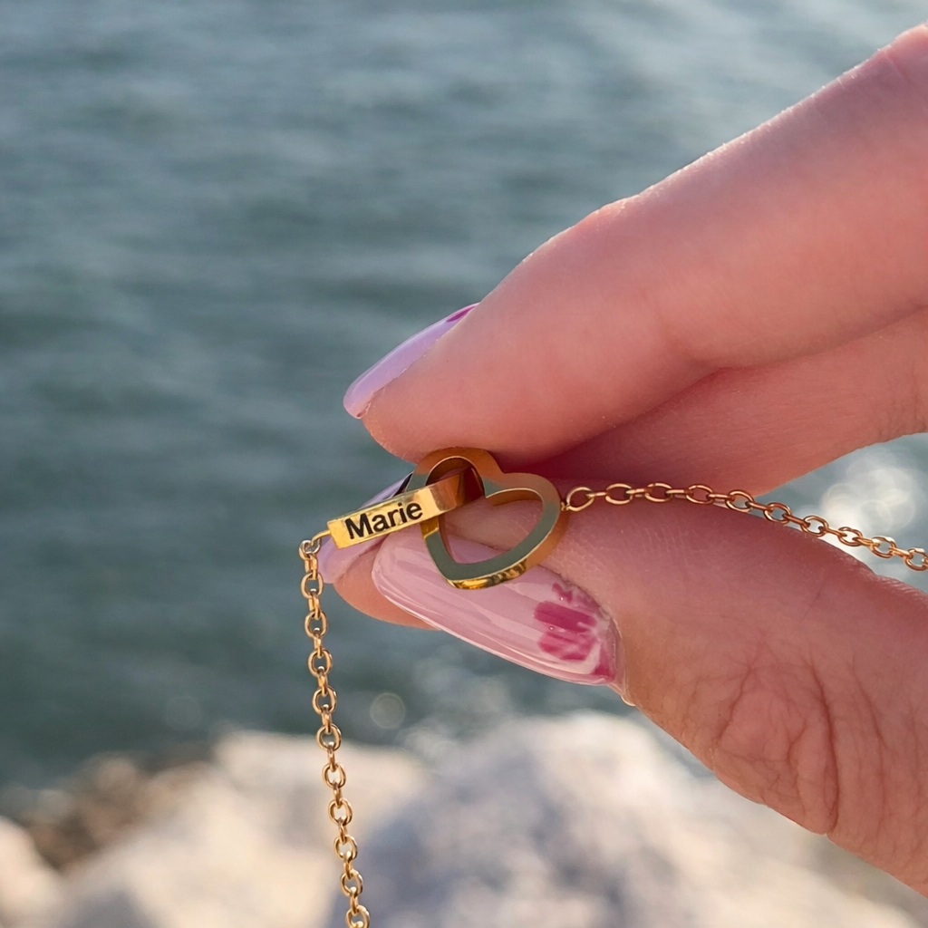 (Custom engraved necklace, adorned with two intertwined hearts, featuring your first names or initials.)